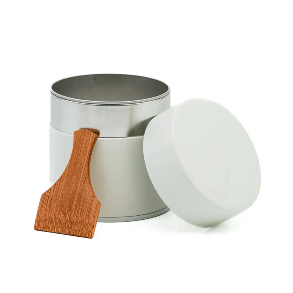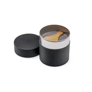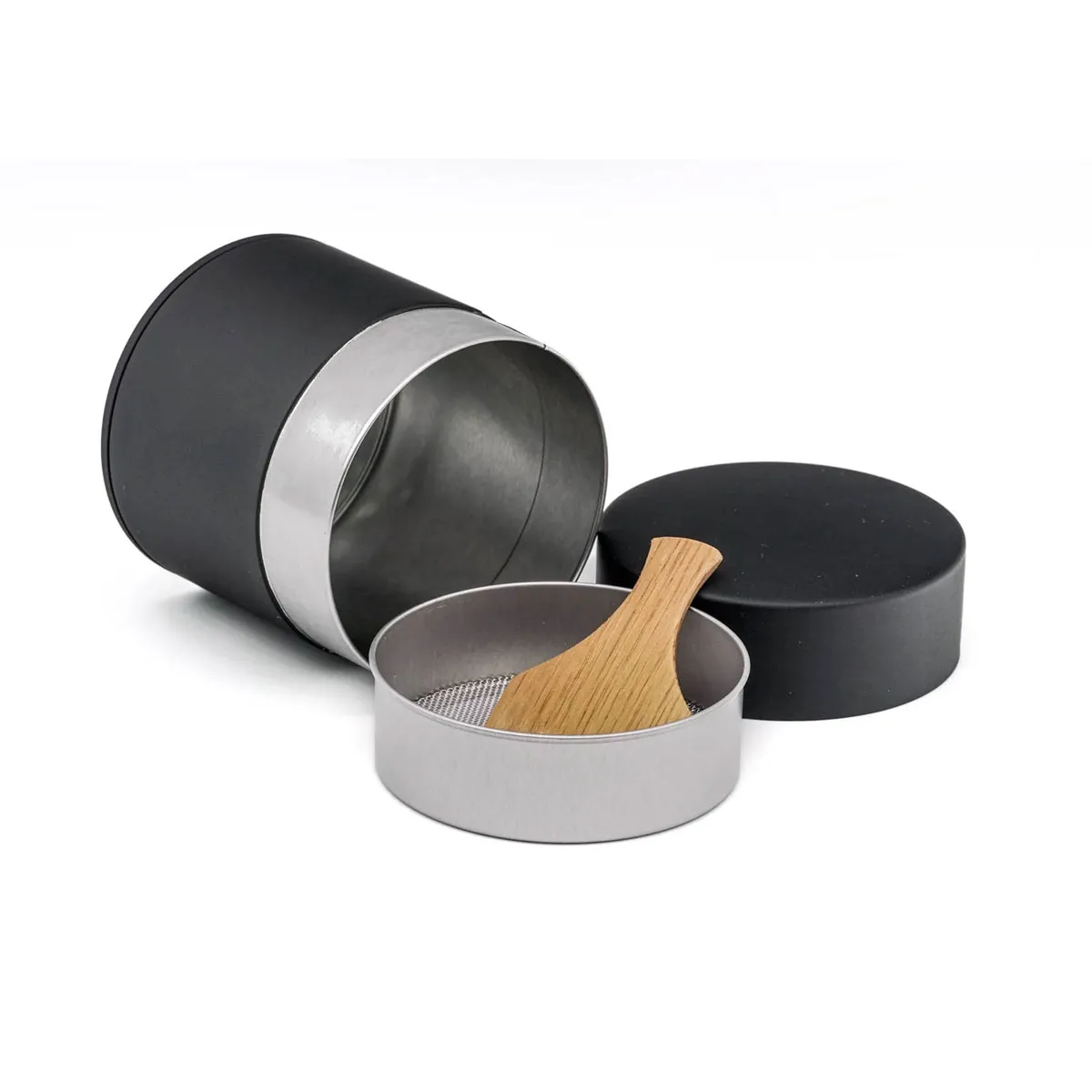 This matcha sifter (tea canister) is made from tin-plated steel coated externally in a matte black or eggshell white lacquer. Featuring an inner screen, and bamboo paddle, this canister is perfect for sifting and storing a new bag of matcha.